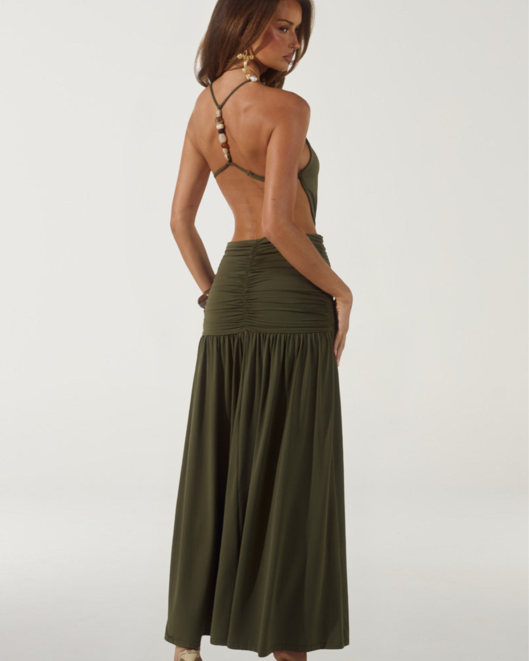 The Halter Neck Ruched Maxi Dress combines elegance with modern sophistication. This floor-length gown features a refined high neckline and striking open back design, creating an effortlessly graceful silhouette. Delicate bead embellishments add dimension, while strategic hip ruching flatters your figure. A practical side split allows ease of movement, and the lined, stretch fabric ensures comfort throughout the day or evening.