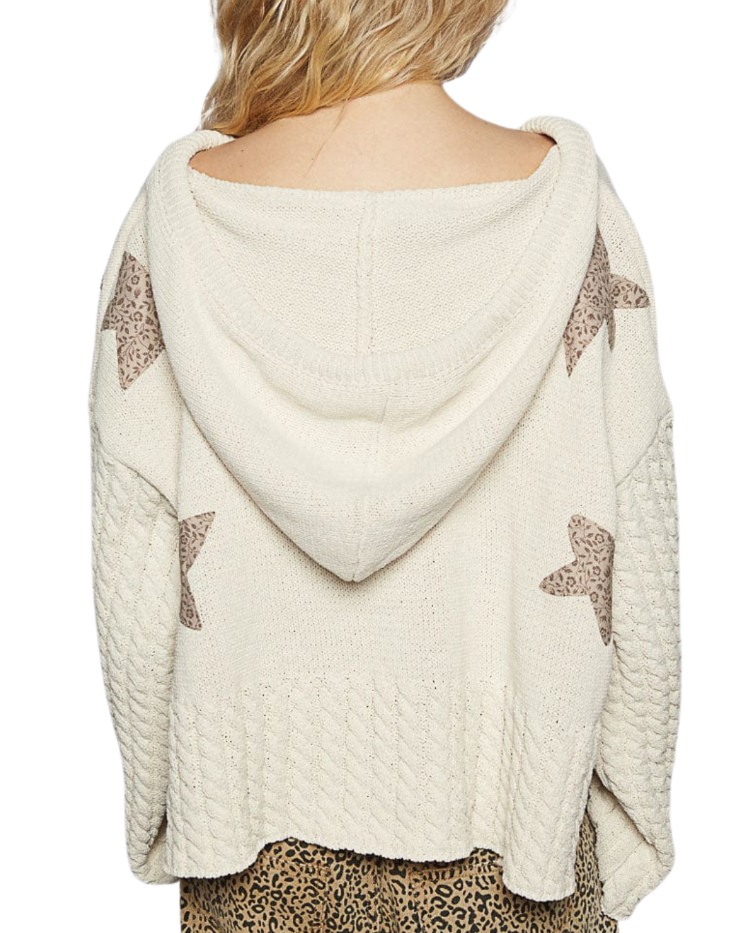 Embrace cozy sophistication with this Cable Knit Chenille Hooded Sweater, featuring a relaxed oversized silhouette perfect for effortless layering. The semi-cropped cut offers a modern twist on a classic style, while decorative chenille star patches add playful dimension to the design. Complete with a comfortable hood, this piece seamlessly transitions from casual weekends to relaxed workdays. Crafted for warmth without bulk, it's an essential addition to any versatile wardrobe.