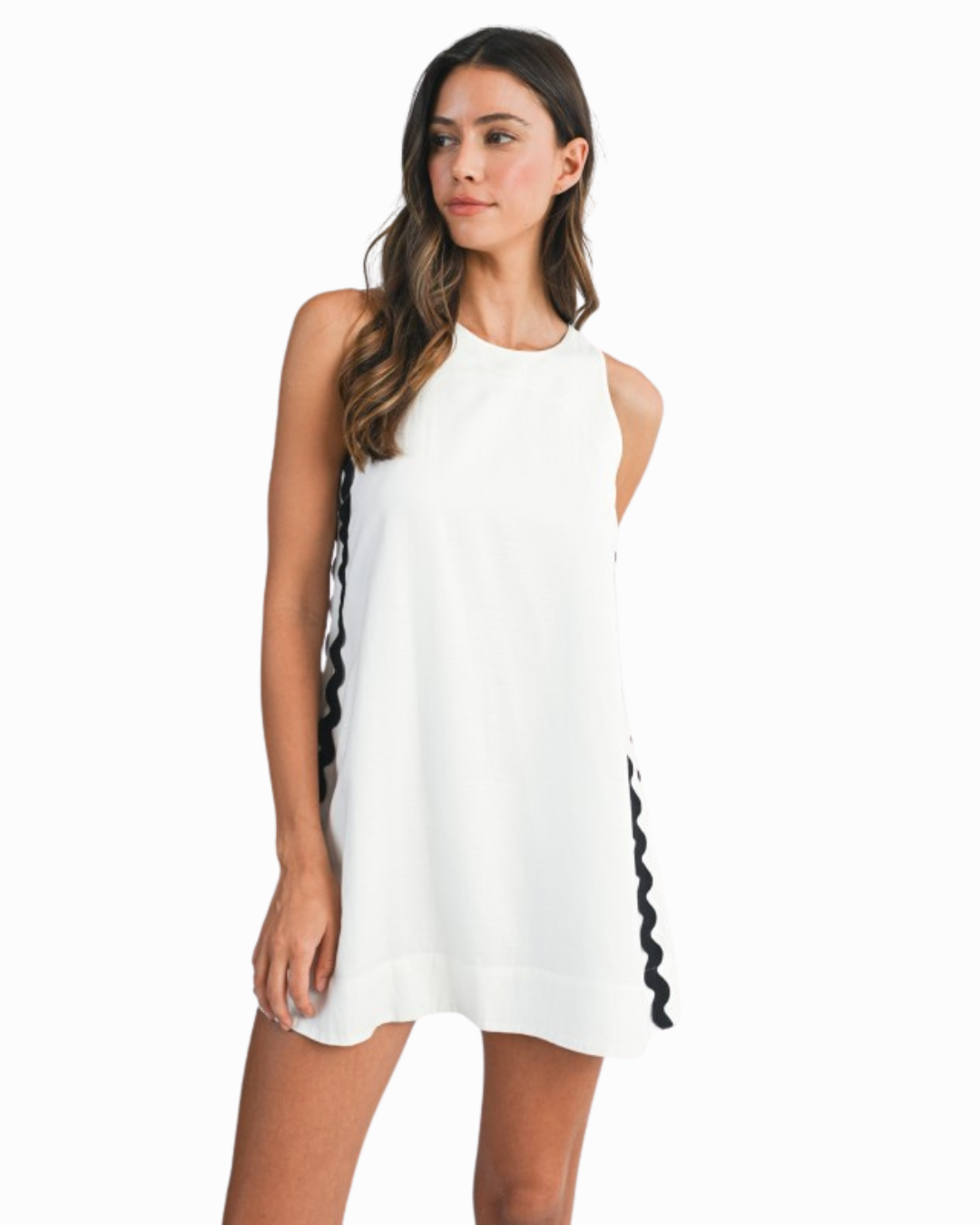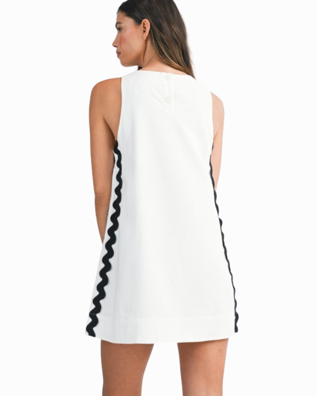 Effortless elegance meets timeless style with this Linen A-line Mini Dress. Designed with a sleeveless silhouette and flattering shift cut, it offers comfortable all-day wear. The contrasting black side trim adds a sophisticated detail, while the back button closure provides both function and visual interest. Perfect for warm-weather occasions, from casual outings to elevated events.