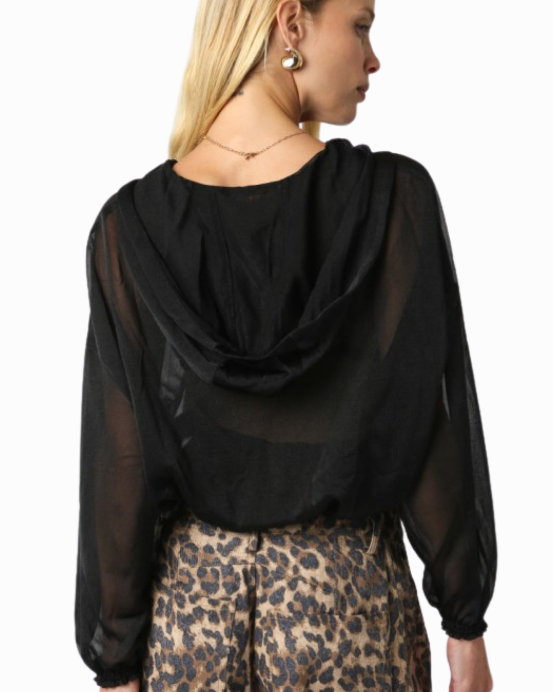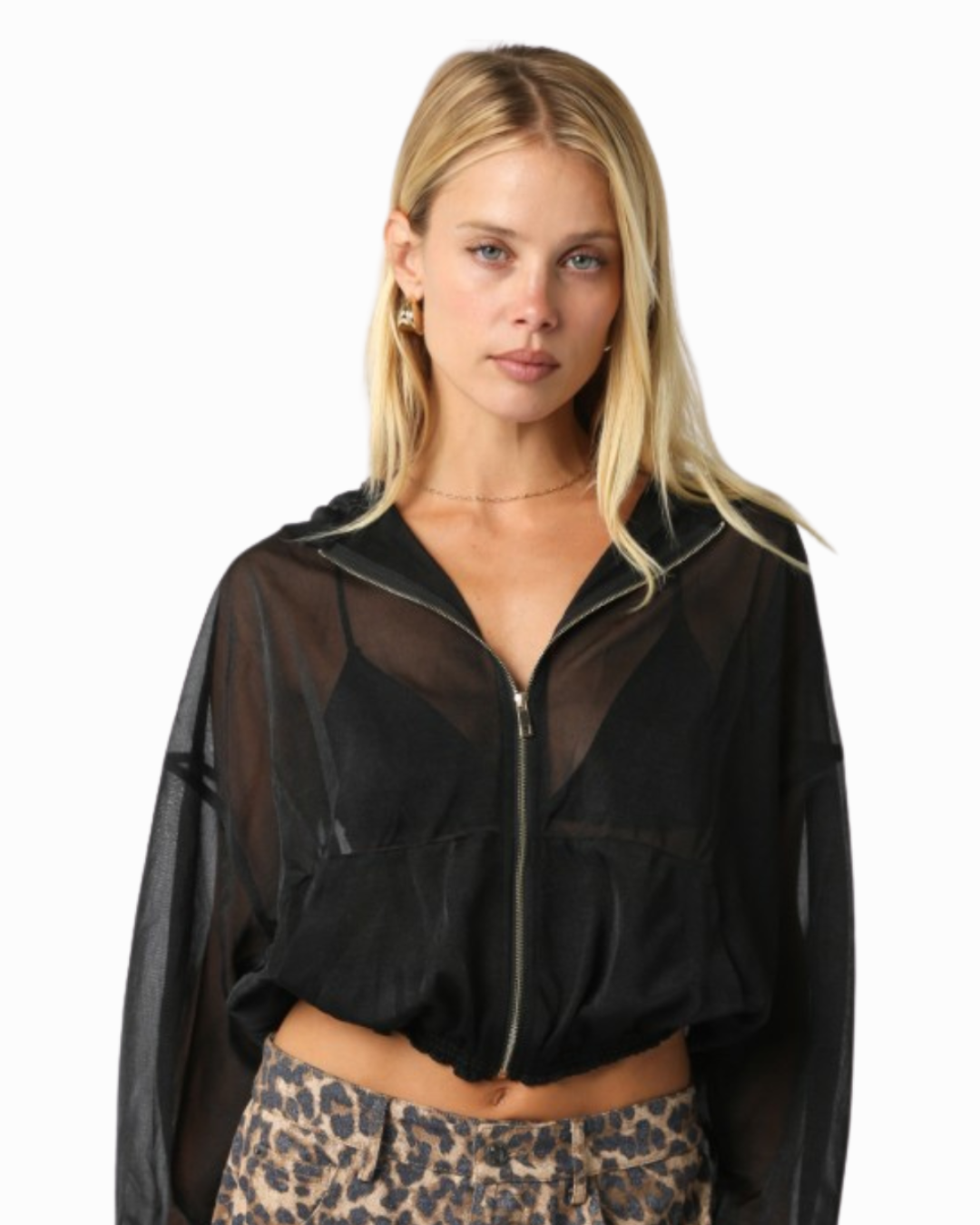 Elevate your layering game with this Sheer Hooded Zip-Up Jacket. Featuring a striking sheer material with a functional zipper closure, this piece seamlessly blends style and versatility. The hood provides coverage while the breathable mesh construction keeps you comfortable throughout the day.