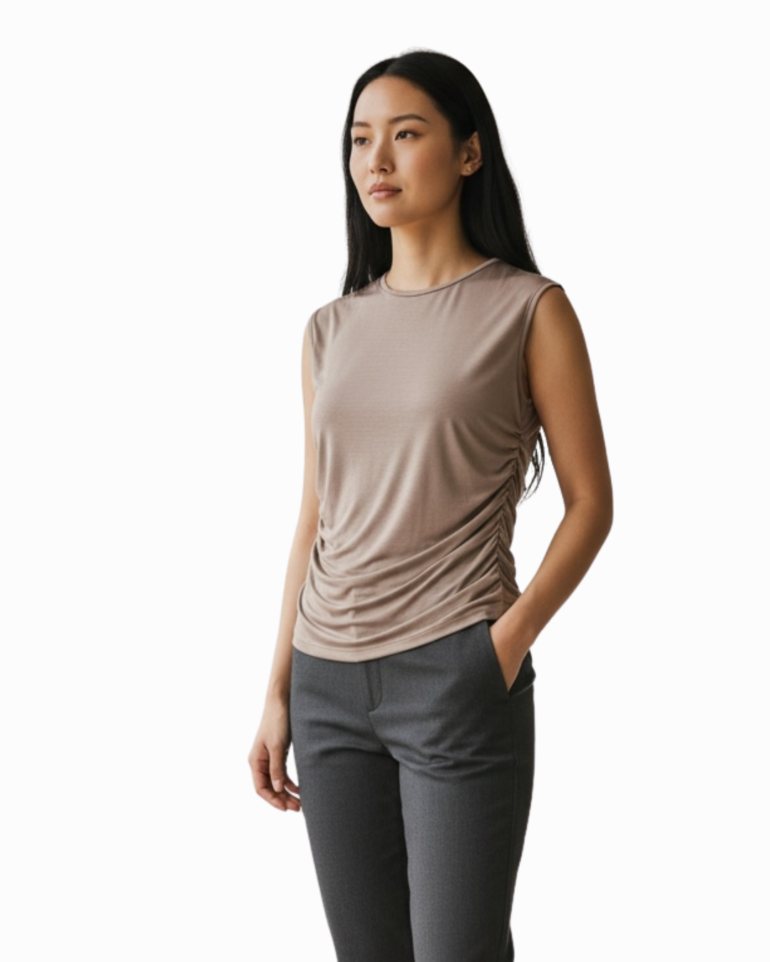 Effortlessly chic and endlessly versatile, this Ruched Sleeveless Tank Top features a flattering ruched waist that defines your silhouette while maintaining a lightweight, breathable feel. The thoughtfully gathered waist detail adds dimension and movement, creating a polished appearance that complements various body types. An essential wardrobe staple.