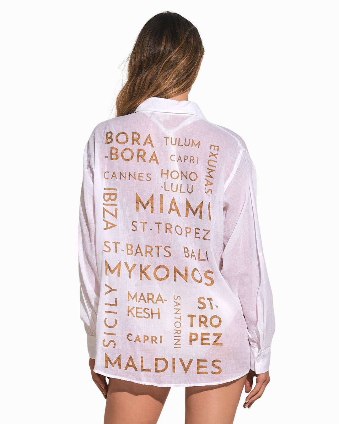 This Mykonos Button-Down Shirt features graphics on back adding a fun touch to a classic style. Perfect for layering or wearing on its own, it's a playful addition to your vacation or summer wardrobe