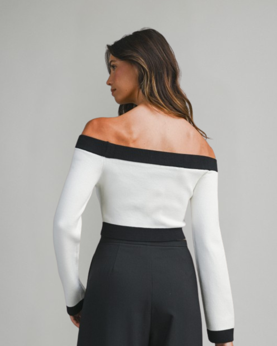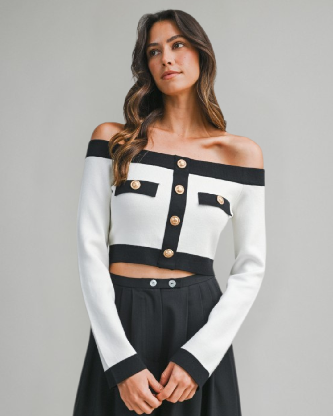 Effortlessly chic, this off-the-shoulder knit top combines contemporary style with timeless appeal. The slip-on design offers convenient dressing, while delicate gold button accents add a touch of sophistication. Striking contrast black and white detailing elevates the look. Long sleeves provide versatile coverage.